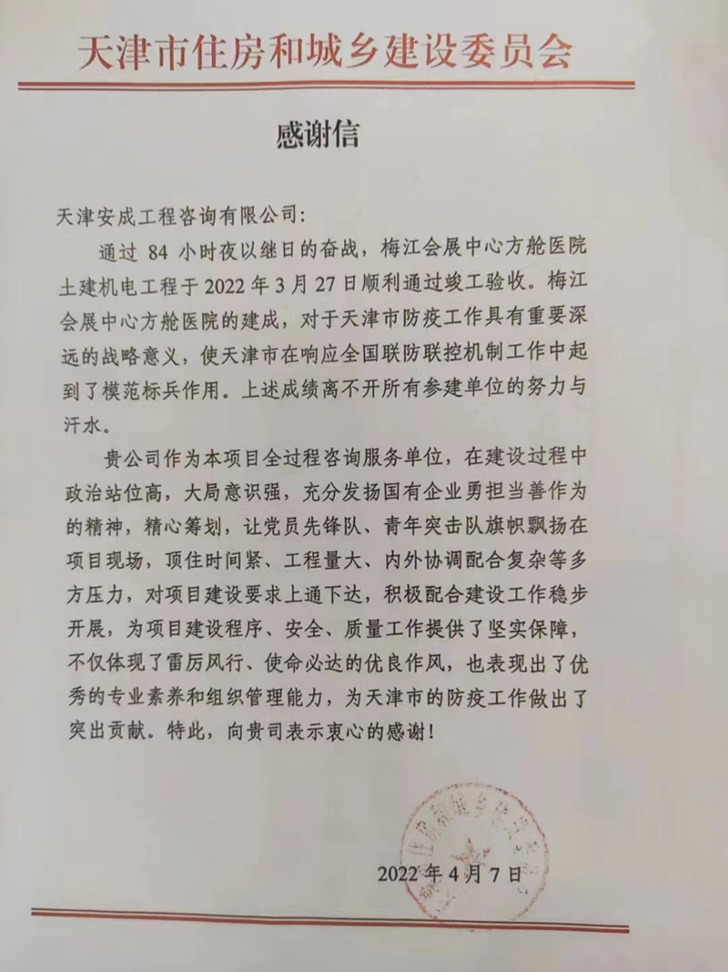 經過84小時夜以繼日的奮戰,梅江會展中心土建機電工程于2022年3月27日順利通過竣工驗收。4月7日,天津市住房和城鄉建設委員會向安成公司發來感謝信,對安成公司在項目建設過程中體現出的雷厲風行、使命必達的優良作風以及優秀的專業素養和組織管理能力給予了高度認可。