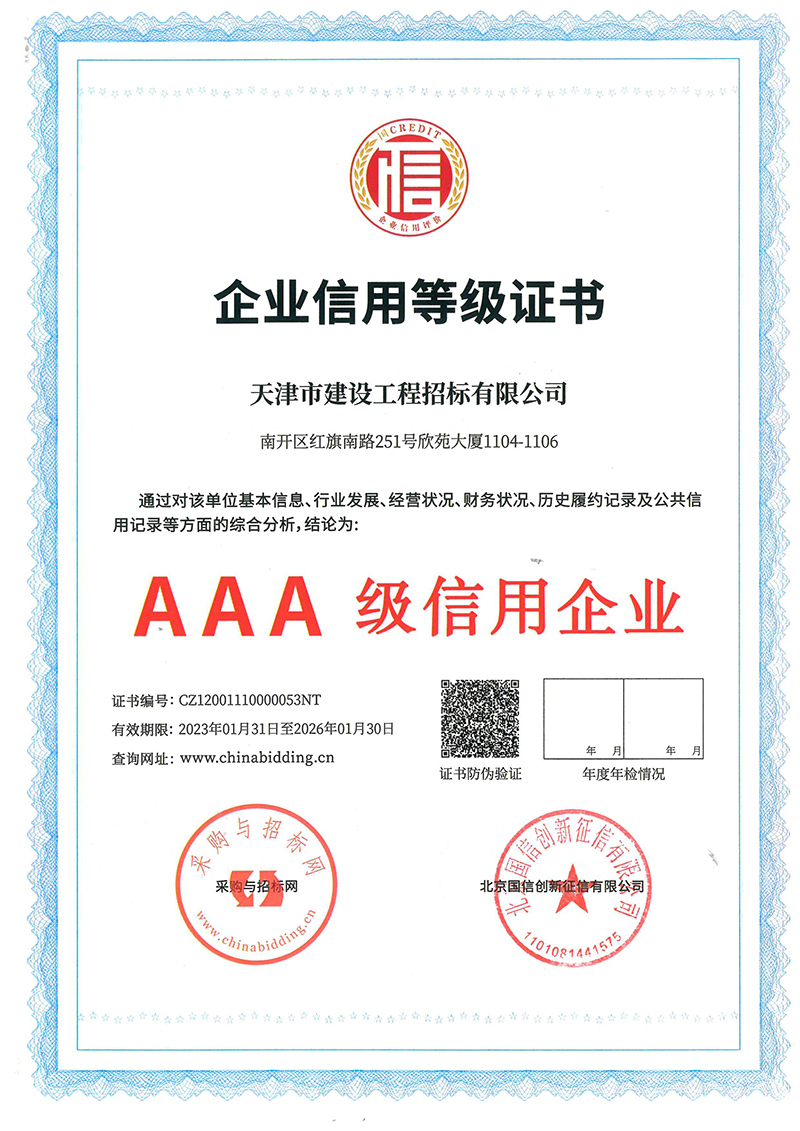近日,從天咨公司下屬招標公司傳來喜訊,招標公司在采購與招標網(wǎng)以及北京國信創(chuàng)新征信有限公司聯(lián)合組織的企業(yè)信用等級等有關評選中,獲評3A級信用企業(yè)和3A級優(yōu)秀招標代理企業(yè)。